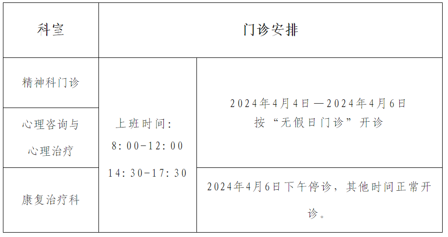 根據(jù)《國(guó)務(wù)院辦公廳關(guān)于2024年部分節(jié)假日安排的通知》精神,結(jié)合醫(yī)院工作實(shí)際,醫(yī)院決定清明節(jié)(2024年4月4日—2024年4月6日)放假,4月7日補(bǔ)休上班。放假期間,門診工作安排如下: