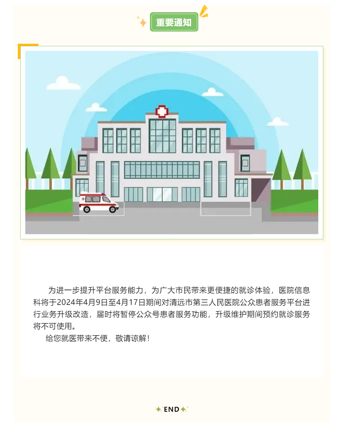 關(guān)于更換清遠市第三人民醫(yī)院微信公眾號上患者服務(wù)平臺的通知