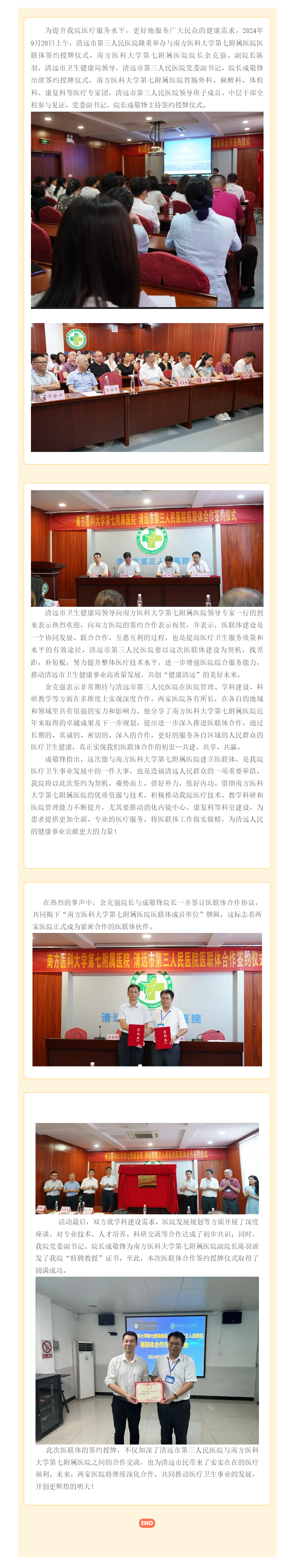 攜手共建醫(yī)聯(lián)體,優(yōu)質(zhì)醫(yī)療惠民生--南方醫(yī)科大學(xué)第七附屬醫(yī)院與清遠(yuǎn)市第三人民醫(yī)院醫(yī)聯(lián)體簽約授牌儀式圓滿(mǎn)舉行