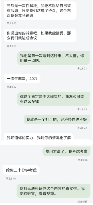 果不其然,對方自稱“私家偵探”,受他人委托搜集到李先生的“私密視頻”,但自己只求財,只要李先生愿意出40萬元一次性解決,自己就銷毀照片和視頻,還稱只給李先生二十分鐘考慮。出于好奇,李先生讓對方發(fā)來視頻驗貨,但對方執(zhí)意讓自己先轉錢,李先生便不再回復。