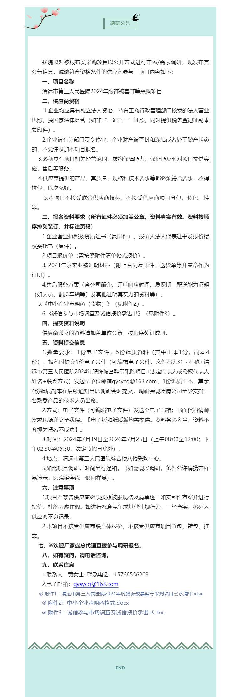 【信息公開】清遠(yuǎn)市第三人民醫(yī)院2024年服飾被套鞋等采購(gòu)項(xiàng)目市場(chǎng)調(diào)研公告