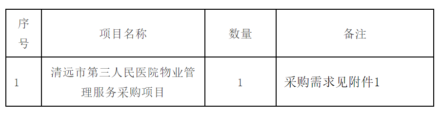 清遠(yuǎn)市第三人民醫(yī)院物業(yè)管理服務(wù)采購項(xiàng)目現(xiàn)進(jìn)行市場調(diào)研公示,開展需求調(diào)查,歡迎符合資格條件的供應(yīng)商參與,調(diào)研征集信息如下: